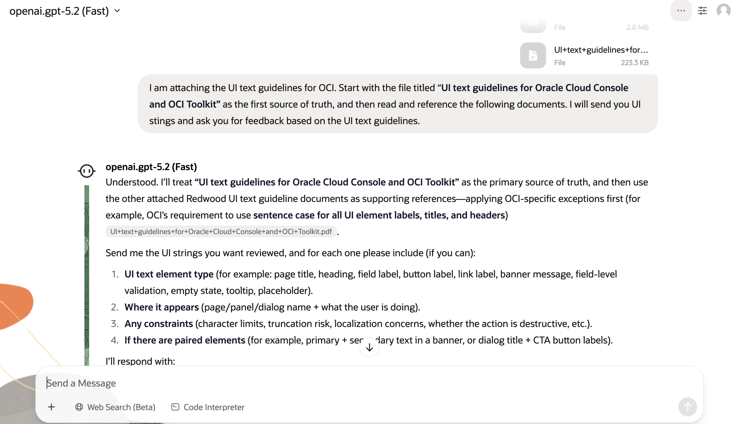 At the same time, OCI maintains roughly 30 multi-page documents outlining UI writing guidelines, covering everything from sentence case rules and banner structure to verb choice and localization risk. Keeping all of that guidance top of mind while reviewing strings at pace was not realistic. Without rigorous review, UI strings could reach customers with unclear messaging, inconsistent terminology, or violations of established content standards.